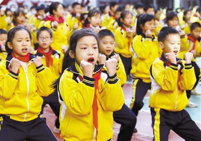 11月10日,衡阳市雁峰区环城南路小学的同学在做《国学武术操》。近年来,湖南省衡阳市雁峰区环城南路小学不断创新大课间活动内容,将传统文化、趣味游戏与体育运动相互融合,让学生在丰富多彩的文体活动中锻炼身体,快乐成长。