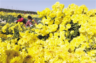 11月10日,温县武德镇徐堡村村民在采收怀菊花。初冬时节,在河南省焦作市温县,怀菊花陆续进入收获季,当地农民们抓紧晴好天气采收、加工、销售。 新华社发(徐宏星摄)