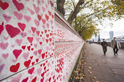11月9日,人们经过英国伦敦泰晤士河沿岸的国家新冠纪念墙。英国政府9日公布的新冠疫情数据显示,英国当日新增确诊病例33117例。 新华社发(史蒂芬·程摄)