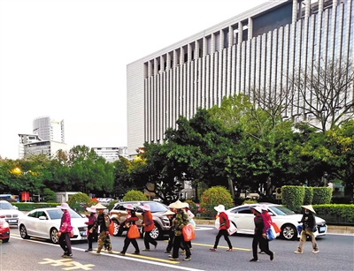 前天下午临近下班,记者在龙岩行政中心北门前的道路上看到这样一幕,十几个行人“组团”集体横穿马路,队伍很“壮观”。他们不走斑马线、不过天桥(不到50米远),随意横穿马路,既带来交通安全隐患,又影响文明城市形象。 记者 傅利昌 摄