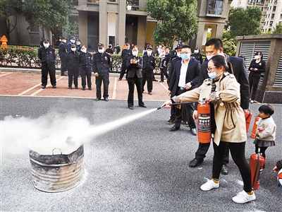 为增强辖区居民消防安全意识,提高辖区物业经营单位消防自救能力,近日,新罗区中城街道双路亭社区组织辖区5家物业经营单位在建发上郡小区共同开展高层建筑消防安全演练活动。图为现场演练。 记者 蓝芳 通讯员 冯建永 摄