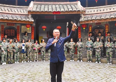 18日下午,在永定区湖坑镇土楼环极楼内,该区中小学生社会实践学校老师江新良正手把手向社会实践研学的学生教唱客家竹板歌。他将党的十九届六中全会精神,改编成韵律十足的歌词,并融入脍炙人口的竹板歌,向群众宣传宣讲,推动全会精神入脑入心、落地生根。悠扬动听的山歌回荡土楼,吸引了当地众多干部和群众驻足观看。 记者 傅长盛 通讯员 黄秋萍 摄