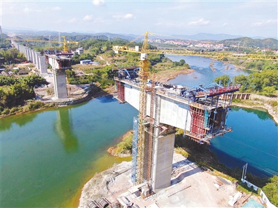 由中铁二十四局承建的龙龙铁路上杭汀江特大桥,是全线控制性工程,全桥长1731.16米,共含44个墩2个桥台。今年来,项目部积极开展党史学习教育,并将学习成果转化为项目建设的强大动力,至目前,该桥桩基、承台已全部完成施工。图为近日航拍的施工现场。 记者 傅长盛 摄