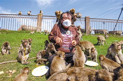 11月28日,工作人员在泰国华富里给猴子喂食。当日,有泰国“猴城”之称的华富里举办一年一度的“猴子自助餐节”,人们为猴子提供水果和饮料,感谢它们吸引游客前来。