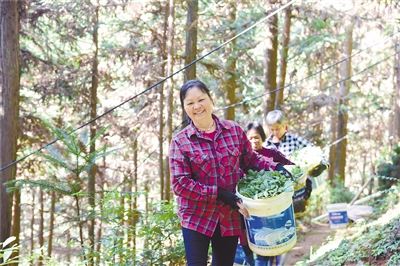 近日,张寿福的合家欢家庭农场内,张寿福的夫人及前来帮忙采摘白背草的村民满载而归露出会心的笑容。