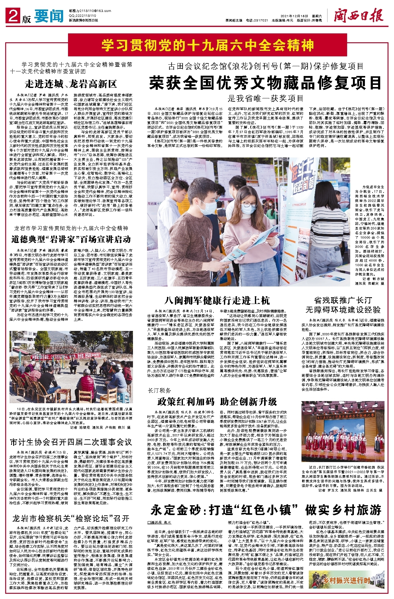 报告会上,宣讲团成员从深刻认识总结党的百年奋斗重大成就和历史经验的重大意义、党的百年奋斗的初心使命和重大成就、中国特色社会主义新时代的历史性成就和历史性变革等6个方面对党的十九届六中全会精神进行全面宣讲和深入解读。同时,联系龙岩实际,从深刻把握省第十一次党代会的主题、过去五年发展的显著成就和宝贵经验、福建发展总纲领总遵循等6个方面,对省第十一次党代会精神进行深入阐释。