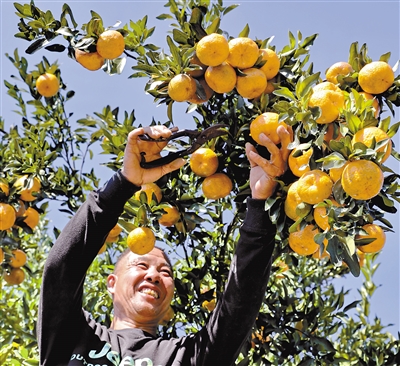上杭县下都镇村民李金金,原在汀江棉花滩库区下都段围网养鱼、捕鱼,2015年转产上岸,在库区家门口创业发展河湖经济,库湾植树造林100亩,并种植沙田柚、血橙、黄金果、金桔等100多亩,年收入达30多万元,并由此带动其他农户发展生态产业,既保护了生态环境,又增加了家庭收入。图为12月17日李金金在自己的生态果园里采摘柑橘。 记者 郑秋生 摄