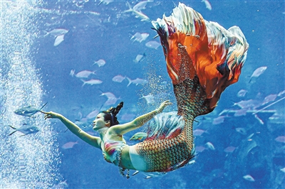 12月21日,首届中国美人鱼表演赛参赛选手在比赛中。当日,由国家体育总局水上运动管理中心等单位主办的首届中国美人鱼表演赛在海南三亚亚特兰蒂斯开赛,共吸引来自国内的40余位选手参赛。 新华社记者 蒲晓旭 摄