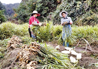 社员们正在采挖成熟的小黄姜,放养的鸭子则在抢食刚翻出的蚯蚓。