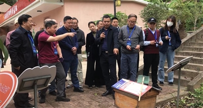 采风团聆听养蜂人钟亮生讲述带领残疾人和贫困户林下养蜂致富的故事 刘少雄 摄