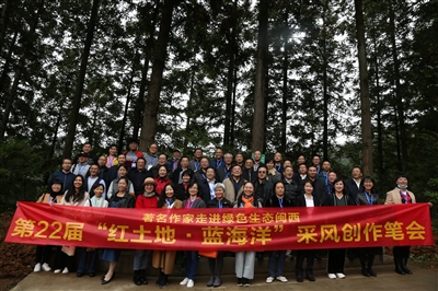 作家们在国家级现代林业科技示范园——白砂国有林场采风时合影 罗焕辉 摄