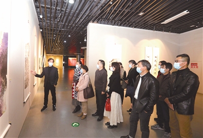 近日,由闽西书画院主办的“翰墨迎新——闽西书画院画师作品展”在龙岩美术馆开展。本次展览共展出80余件书画院书画师们近期创作的作品,作品充分展现画师们的才情智慧和艺术品格。图为市民在观展。 记者 郭亦斌 摄