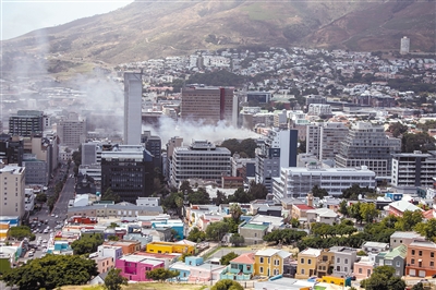 1月2日,浓烟从南非开普敦起火的议会建筑上升起。南非立法首都开普敦负责安全事务的官员2日发表声明说,一栋议会建筑当天清晨着火,且火势蔓延至议会下院国民议会大楼。