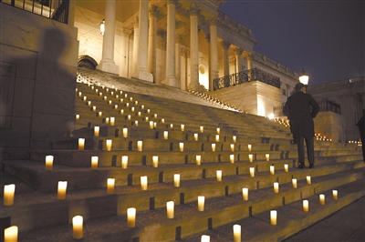 1月6日,美国首都华盛顿国会大厦外摆放蜡烛纪念国会山骚乱事件一周年。2021年1月6日,数千名美国民众聚集在华盛顿国会山并强行闯入国会大厦,试图阻止美国国会联席会议确认美国新当选总统。骚乱事件造成包括一名国会警察在内的5人死亡、约140名执法人员受伤。 新华社 发