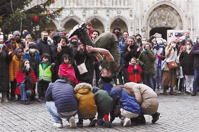 1月7日,街头艺人在比利时布鲁塞尔大广场上表演。由于奥密克戎毒株快速传播,近期比利时新冠病例大幅增加。 新华社记者 郑焕松 摄