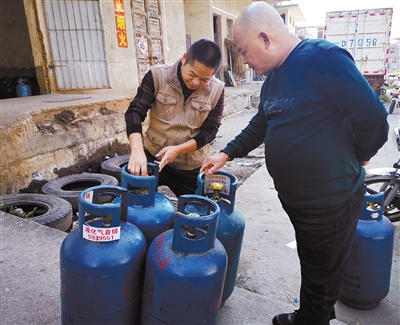 连日来,永定区安全生产督查组前往坎市、培丰、湖雷等乡镇,对液化气、燃气市场展开检查。2021年冬季,永定从住建局、城管局、应急管理局、市场监管局、公安分局等部门抽调人员,成立8个安全生产督查组,对24个乡镇进行督查,督促使用燃气的企业、工厂、个体用户安装报警装置,摸排了38家工商业安装情况,对未安装报警装置、使用过期液化瓶的下达整改通知书,整改不到位的进行行政处罚。图为督查组对液化气钢瓶的保质期与阀门质量进行检查。 通讯员 林忠成 陈美鹏 摄