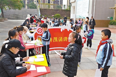昨日,为全面贯彻落实国家“双减”政策,龙岩市松涛第二小学举行2021-2022学年第一学期一、二年级无纸化综合测评活动。该校别开生面,采用游园、智趣闯关的方式组织测试。闯关科目包括语文、数学、音乐、美术、体育,有火眼金睛识汉字、口算小达人、线描画小巧手等10多项,1000多名一、二年级学生感受到了“考试”的快乐。 记者 曾志明 郭亦斌 摄