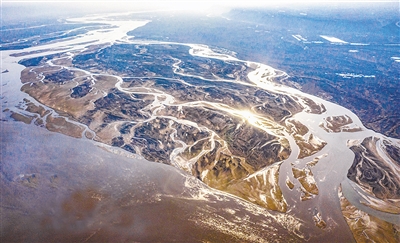 近期,山西省运城市万荣县境内的黄河河床未结冰,裸露的河床上无数条涓涓细流和被水流冲刷后留下了痕迹交织在一起,形成无数美丽图案,空中俯瞰,宛如仙女飘带,在大地上飞舞,美不胜收。 (人民网)