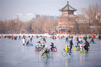 近日,北京什刹海冰场,市民游客尽情畅滑,感受冰上运动带来的乐趣。随着北京冬奥会的临近,冰雪运动成了时下最时髦的娱乐活动。 (人民网)