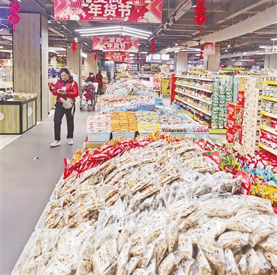 随着春节临近,我市年货市场货源品种丰富,供货充足,价格平稳,市民们有序选购,呈现购销两旺的态势。为保证春节期间市场稳定和供应充足,连日来,我市市场监管局、商务局等多个部门分别深入商场超市、集贸市场开展检查指导工作,确保春节期间粮、油、菜、肉、蛋、奶等生活必需品货源充足、品种丰富,同时严厉打击假冒伪劣、哄抬物价等扰乱市场秩序的违法行为,营造市场稳定和市民消费安全氛围,确保广大群众过一个欢乐、祥和的新春佳节。图为某商超货源品种丰富。 记者 傅利昌 摄
