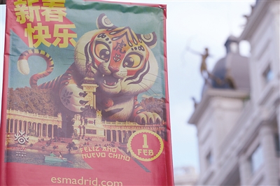 这是1月25日在西班牙马德里市中心拍摄的中国春节生肖海报与贺年标语。西班牙马德里市政府每年都会邀请艺术家设计一款生肖海报,用以装饰街道,迎接中国春节。