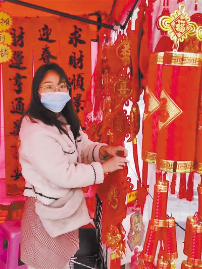 各式各样、创意精美的春联等产品琳琅满目,这位美女老板给顾客介绍产品。