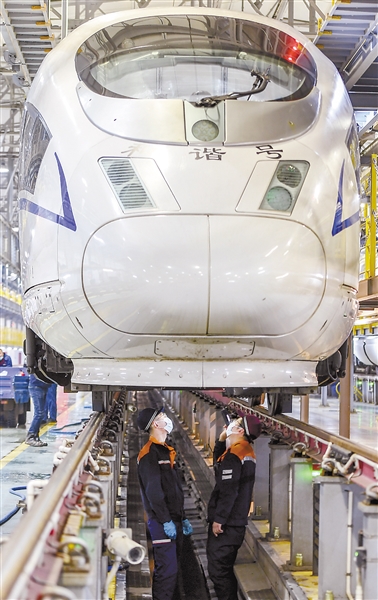 1月23日,在长春动车运用所,信号工刘鑫龙(左)与师父高晨竣检查车下设备。
