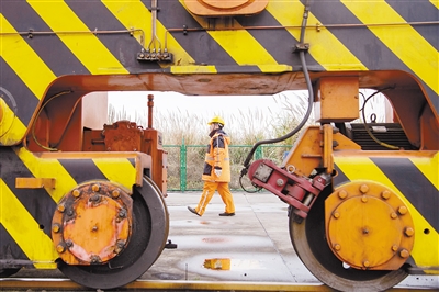1月26日,郑雨双从龙门吊旁走过。郑雨双是中铁联集重庆中心站的一名龙门吊司机,其工作是硬核版“抓娃娃”,他的“游戏室”只有2平方米,离地高达16米,他抓的“娃娃”是重达30吨的集装箱。装载一个集装箱,一般需要近3分钟,而郑雨双只要108秒,一个月下来,郑雨双可以装载2000多个集装箱。郑雨双工作的团结村站是中欧班列在重庆的始发站,每天有大量货物在这里聚集,准备发往欧洲各地。