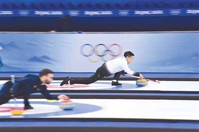2月3日,中国队选手凌智(右)在比赛中。当日,在北京国家游泳中心“冰立方”举行的北京冬奥会冰壶混双循环赛比赛中,中国队以6比5战胜澳大利亚队。新华社记者 黄孝邦 摄