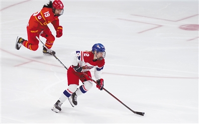 2月3日,捷克队选手阿妮塔·泰拉洛娃(右)在比赛中控球。当日,在五棵松体育中心举行的北京冬奥会女子冰球小组赛中,中国队经过60分钟苦战以1∶3不敌劲旅捷克队。 新华社记者 孟永民 摄