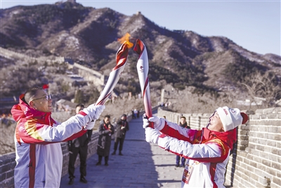 2月3日,火炬手康智(右)与韩小炎进行火炬传递。当日,北京冬奥会火炬在北京延庆八达岭长城传递。北京2022年冬奥会将于2月4日开幕。 新华社记者 张豪夫 摄