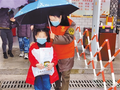 正月初三,在下洋服务区,龙岩高速公路永定片区志愿者为没带伞的小女孩遮雨。龙岩高速永定片区积极开展“青春志愿行,温暖回家路”志愿活动,全力服务春运。 通讯员 李荣龙 摄