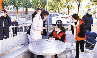 连日来,来自新罗区直机关的干部和“七彩松涛”志愿者纷纷走进社区,开展“敲门”行动、店铺巡察、信息采集,全力以赴做好春节期间疫情防控、消防安全等各项工作。图为春节期间,志愿者在松涛社区登记省外来岩人员核酸检测结果等信息。