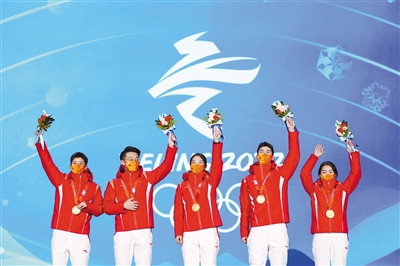 2月6日,中国队选手范可新、任子威、曲春雨、武大靖、张雨婷(从左至右)在奖牌颁发仪式上。当日,北京2022年冬奥会短道速滑混合团体接力奖牌颁发仪式在北京赛区颁奖广场举行。 新华社记者 鞠焕宗 摄