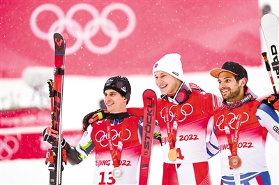 2月13日,冠军瑞士选手马尔科·奥德马特(中)、亚军斯洛文尼亚选手扎恩·克拉涅茨(左)、季军法国选手马蒂厄·费弗尔在颁奖仪式上。当日,北京2022年冬奥会高山滑雪男子大回转比赛在延庆国家高山滑雪中心举行。