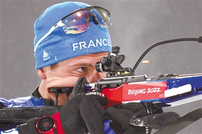 2月13日,法国选手康坦·菲永·马耶在比赛中射击。当日,北京2022年冬奥会冬季两项男子12.5公里追逐比赛在国家冬季两项中心举行,法国选手康坦·菲永·马耶获得冠军。 新华社记者 詹彦 摄