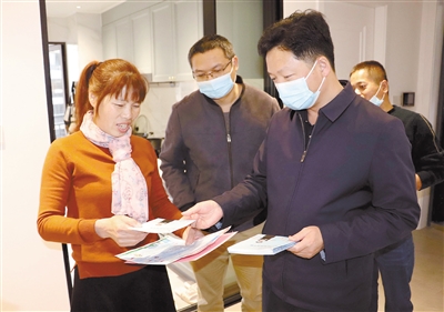 近日,永定区住建局检查组进入凤城街道燃气用户家庭、饭店酒家等,检查燃气设备使用与维护情况,向用户宣讲《燃气管理条例》等法律法规,教给用户正确使用阀门、仪表、感应开关等部件的方法,杜绝擅自更改管道,把抹桌布、毛巾攀附在燃具、管道等不安全行为,共发放《燃气使用注意事项》等近500份材料。图为检查组向用户发放燃气材料的场面。 通讯员 林忠成 摄