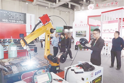 机械智能制造企业在机博会展馆演示焊接机器人焊接技术。