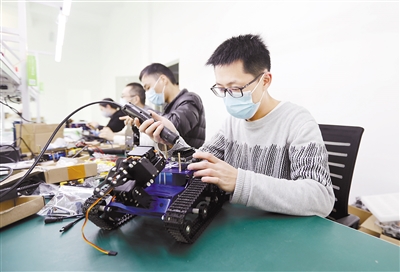 上杭县科技创业园内,福建振杭机器人装备制造公司的工人正在组装用于教育教学领域的机器人。
