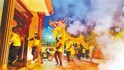 每年的正月十二,永定区湖雷镇白栋村都会举行一年一次的闹元宵活动,村民们通过舞龙进每家每户的家门和烧松光,祈求新一年的吉祥如意!图为永定区白栋村的舞龙进家门的场景。 记者 郭亦斌 通讯员 熊川 摄