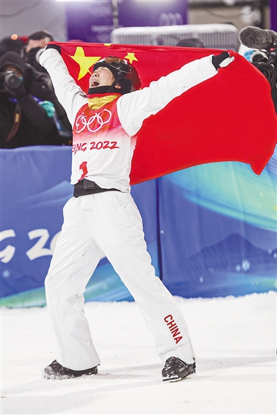2月14日,中国选手徐梦桃在比赛后庆祝。当日,北京2022年冬奥会自由式滑雪女子空中技巧决赛在张家口云顶滑雪公园举行,中国选手徐梦桃夺得冠军。 新华社记者 吴壮 摄