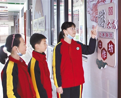 高年级姐姐对学弟学妹讲解传承“游大龙”文化。