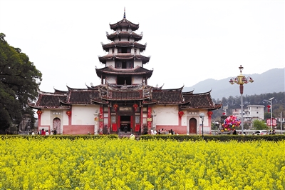 近日,位于永定区高陂镇西陂天后宫前的油菜花陆续开放,金黄色的成片油菜花和天后宫相映成趣,组成一幅美丽的春日画卷,吸引众多游客前来踏春赏花。 记者 施薇 摄