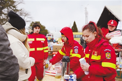 2月27日,在罗马尼亚北部与乌克兰接壤的锡雷特,工作人员为入境的乌克兰民众提供热饮。