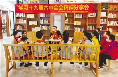 日前,新罗区西陂街道华莲社区迎来一批小客人,由龙岩师范附小与龙岩第二实验小学共12名少先队员组成的“雏鹰小分队”,在“全国文明家庭”荣誉称号获得者、福建省红领巾巡讲团成员廖志添的带领下来到这里参加“爱家爱国更爱党”主题实践活动。图为同学们在社区书吧内听廖志添宣讲有关知识。记者 林阿玲 摄