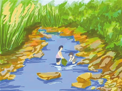 除了在河里游泳、戏水外,抓鱼也是很有趣的。用畚箕轻快地插放在小溪出口或岸边油油的水草边,用脚伸进前面的水中或草里搅动着往畚箕口一赶,再敏捷地把畚箕提出水面,便有只只活蹦乱跳的鱼儿被你活捉了,一把抓住鱼身,鱼儿便只有在你手中乱摆的份了。更显功夫的当然是把游累的鱼儿赶进石缝间或直接把手伸进石缝里把鱼摸住,自然,这也是有些危险性的,比如阴森的石缝中也许正藏着一条水蛇。不过,当你把一条条的鱼儿放入预备的水桶或玻璃瓶中,看着它们用嘴惶恐地乱啄着红色的塑料桶壁或透明的瓶体,吐出一串串圆溜溜的小气泡时,那份收获的满足便会在你心头荡漾开去……