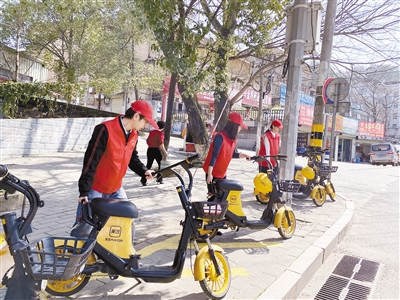 近日,长汀公路中心组织志愿者深入社区、街边商铺,开展“弘扬雷锋精神 深化文明实践”主题活动。活动中,志愿者们手持扫帚、畚斗清理垃圾,并对乱堆乱放、占道经营、车辆违停等现象进行劝导。图为志愿者对共享电动车进行有序摆放。