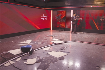 3月13日,在伊拉克库尔德自治区首府埃尔比勒,一家电视台的演播室在导弹袭击中受损。伊拉克库尔德自治区(库区)政府13日说,库区首府埃尔比勒当天遭到12枚弹道导弹袭击,新建成的美国驻埃尔比勒领馆附近区域遭袭,一名平民在袭击中受伤,部分建筑物受损。 新华社 发