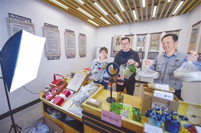 3月16日,在杭州市湍口镇三联村,新乡贤代表、党员志愿者方刚(中)在乡贤工作室的直播间和其他乡贤一起直播推介农特产品。2018年在外创业成功的方刚回到三联村,带领村民发展旅游和特色农产品生产销售。 新华社记者 徐昱 摄