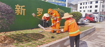 国道319线龙岩高速西出口至小池镇培斜村沿线环境综合整治是市、区两级重点工作。日前,新罗公路中心组织一线养护人员进行植绿工作,现已投入绿化资金5万余元,种植草皮400平方米、种植灌木球22棵、场地整理373平方米、换填土165立方米,并同步开展破损路面的维修及管护,重点做好龙门汽贸城路段整治工作,现已完成2250平方米沥青套补任务。 记者 蔡添高 通讯员 翁学斐 摄